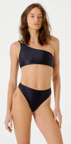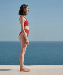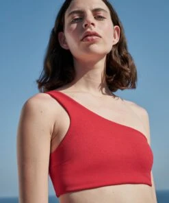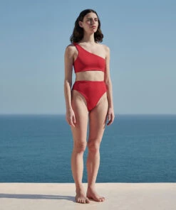Description Red high waist bikini with asymmetric crop top – PERLIN BIKINI RED Haight